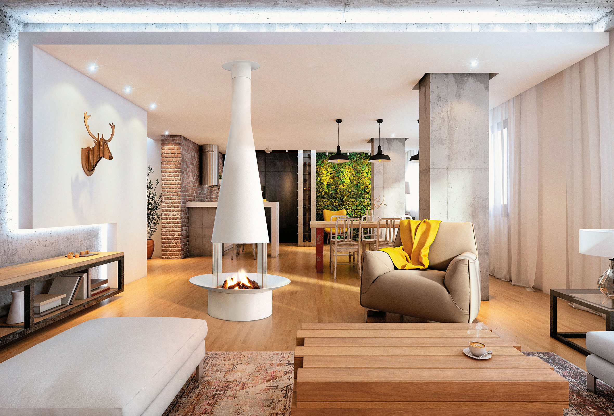 Le Filiofocus est disponible en deux variantes : Bois et Gaz. Les deux versions partagent une hotte conique de 1600 ou 2000 mm et une base accueillant une vasque foyère.