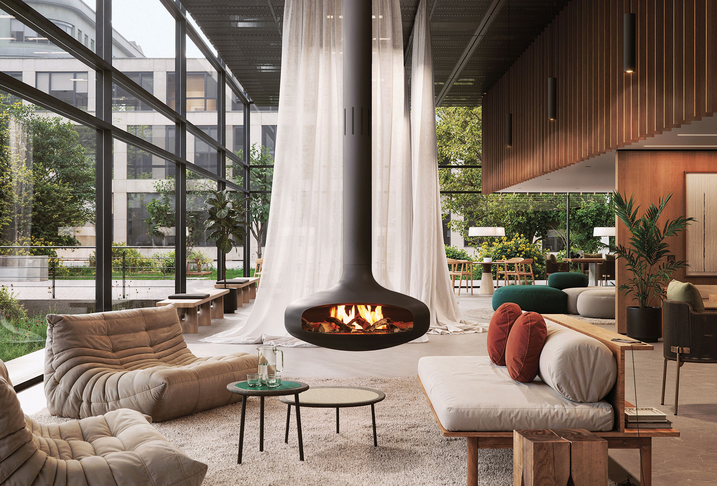 • La contrainte de positionnement du foyer à l’intérieur de la pièce disparait également : le foyer se soustrait aux règles traditionnelles de fumisterie (si la situation le permet).