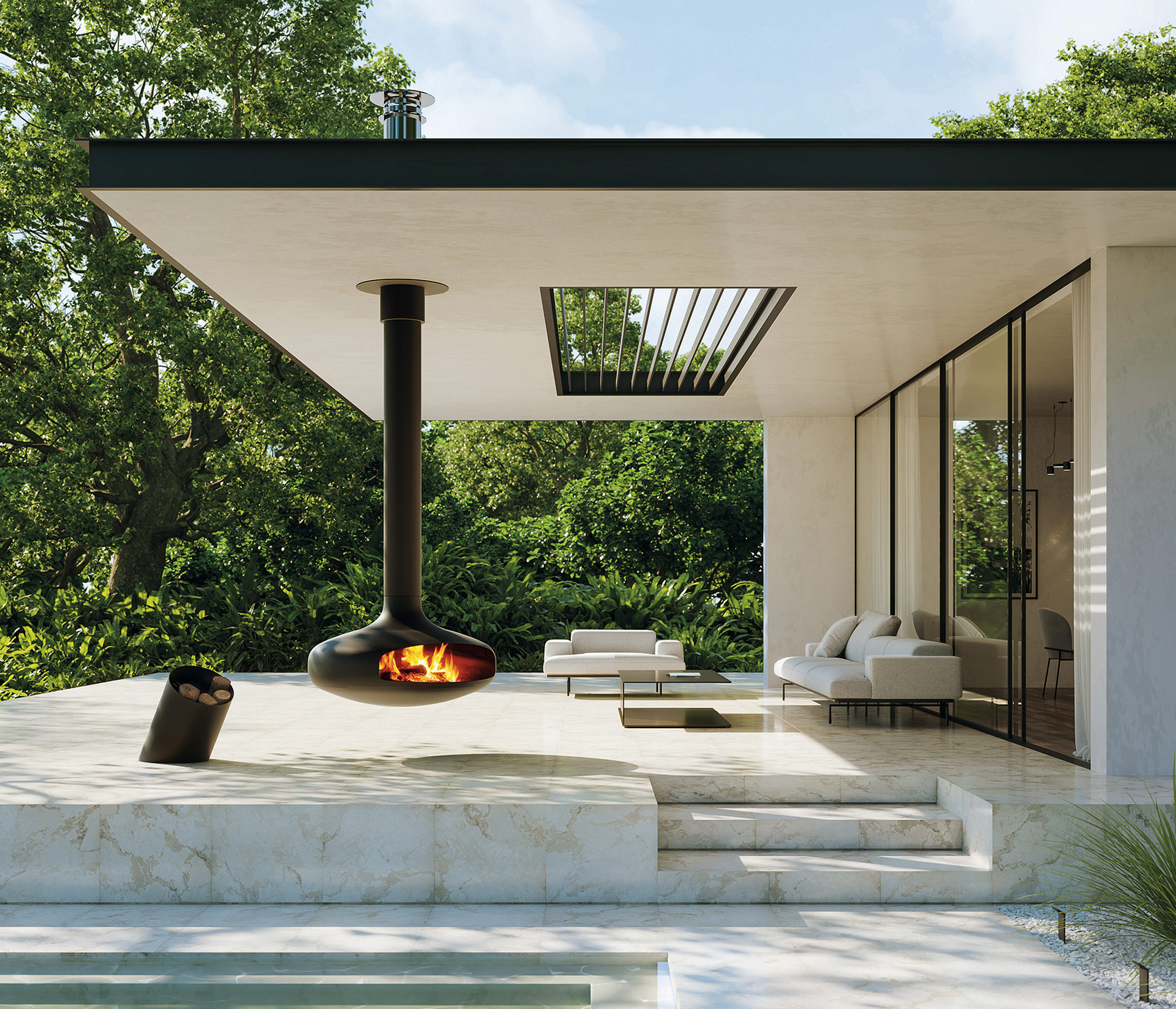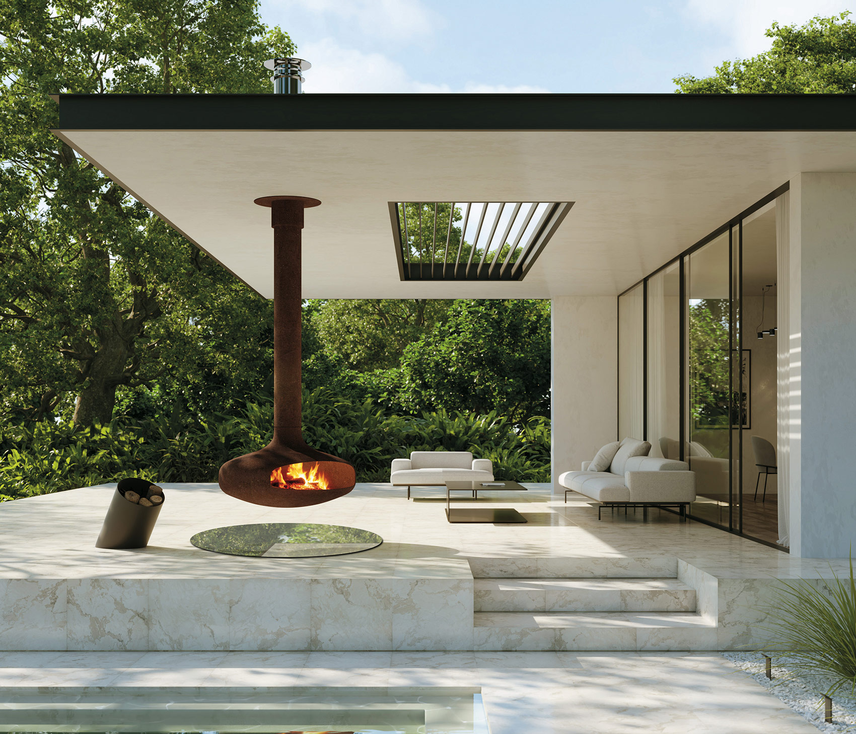 Cheminée design pour l'extérieur, au foyer suspendu et pivotant, fonctionnant au bois.