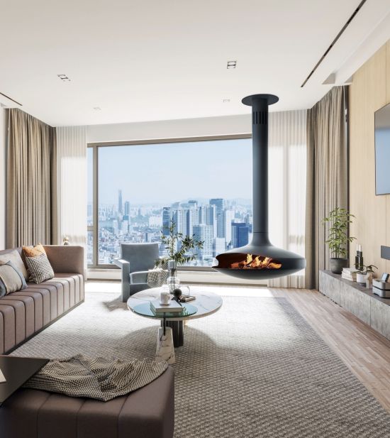 Cheminée au bioéthanol centrale au foyer suspendu et pivotant
